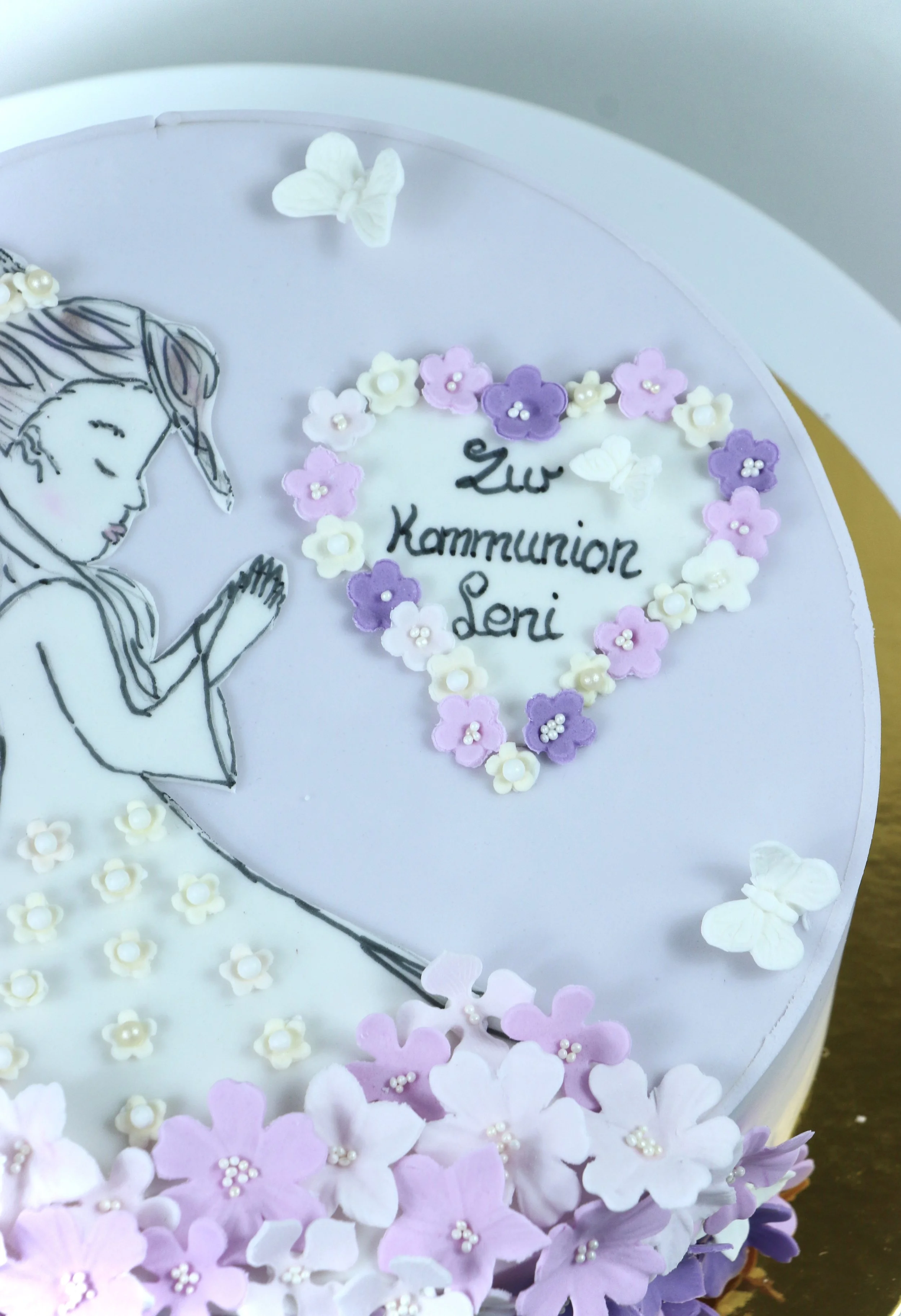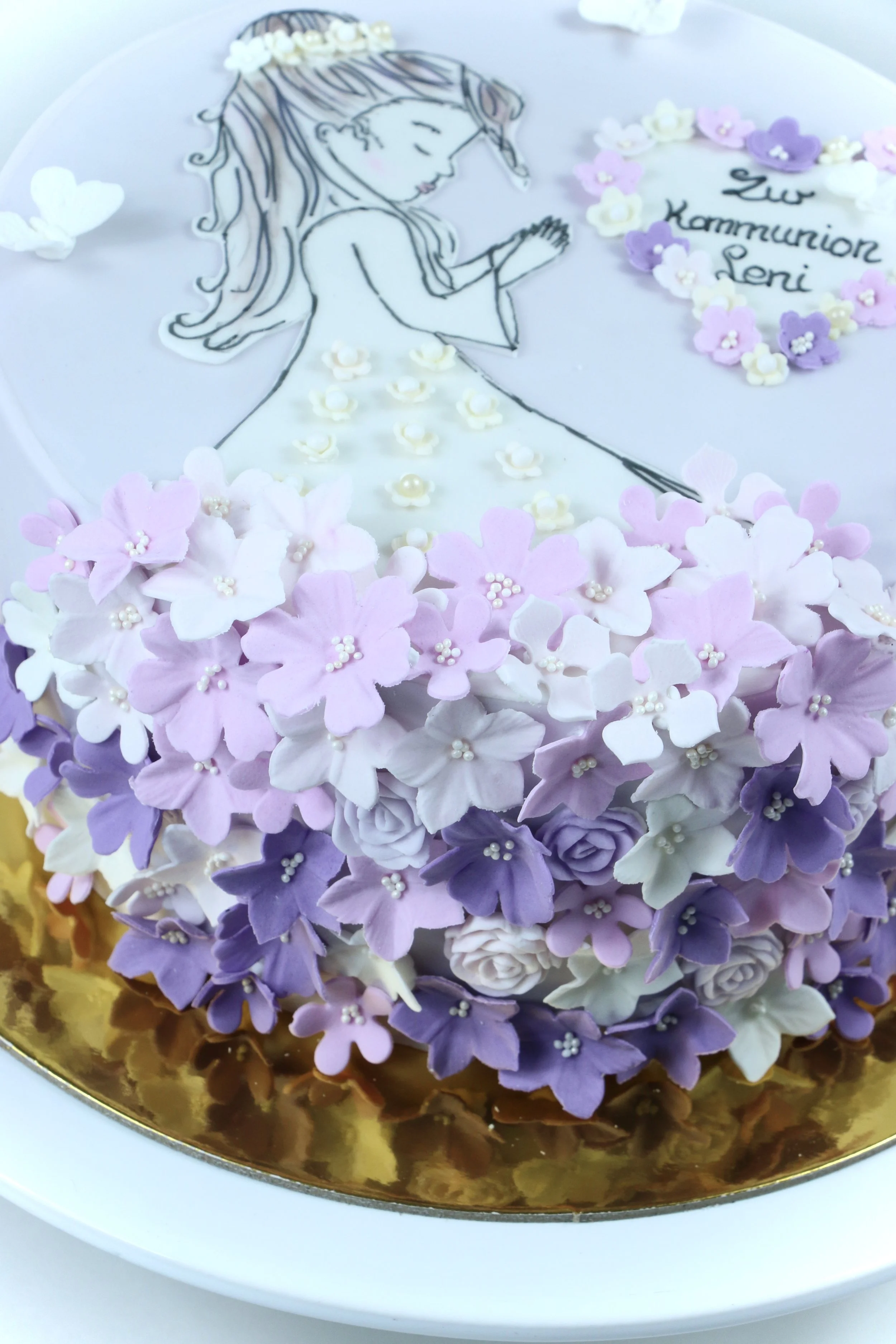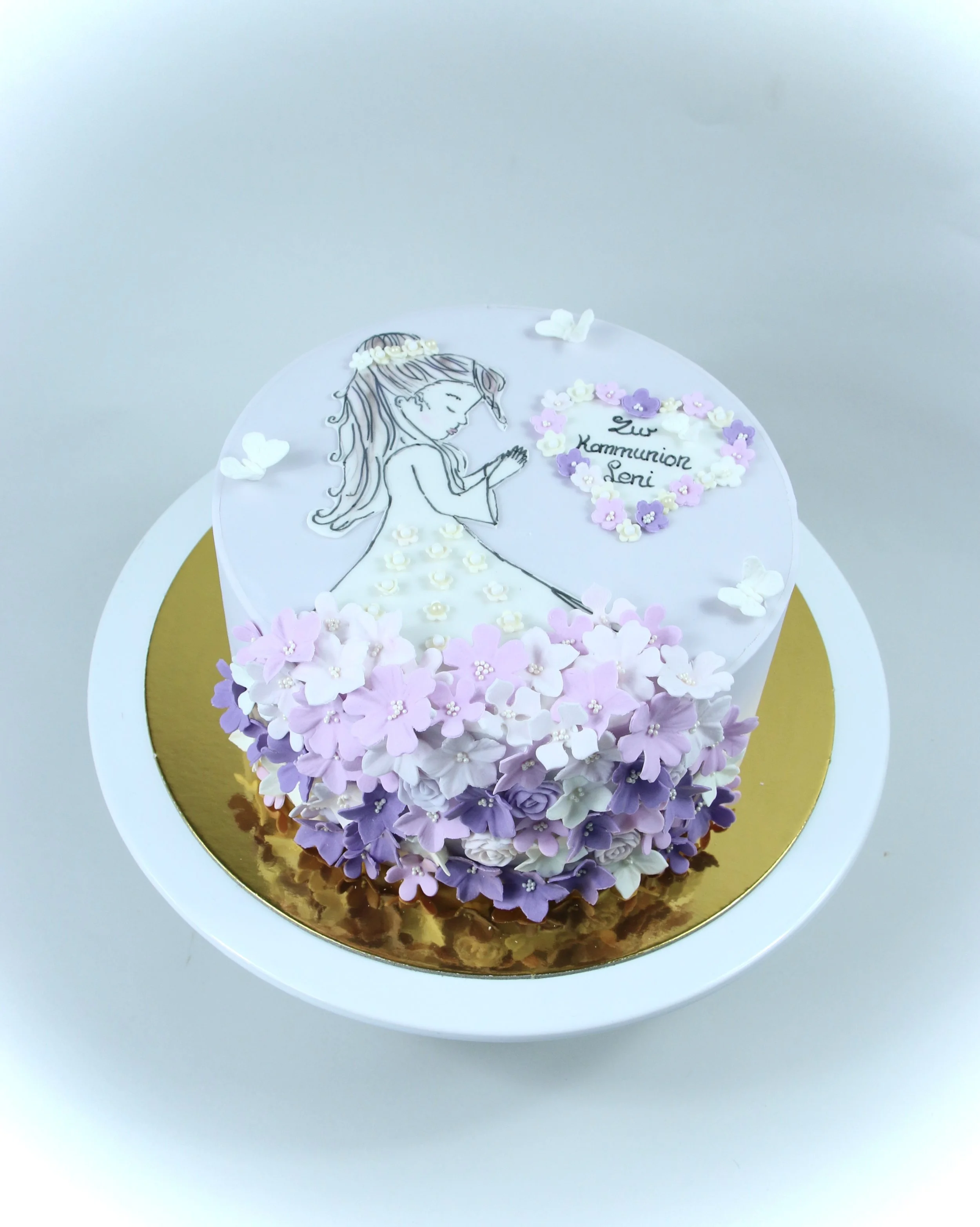 Diese handgefertigte Kommunionstorte verbindet zarte Pastelltöne, florale Eleganz und liebevolle Details – perfekt, um einen ganz besonderen Meilenstein zu feiern. 💜🌸