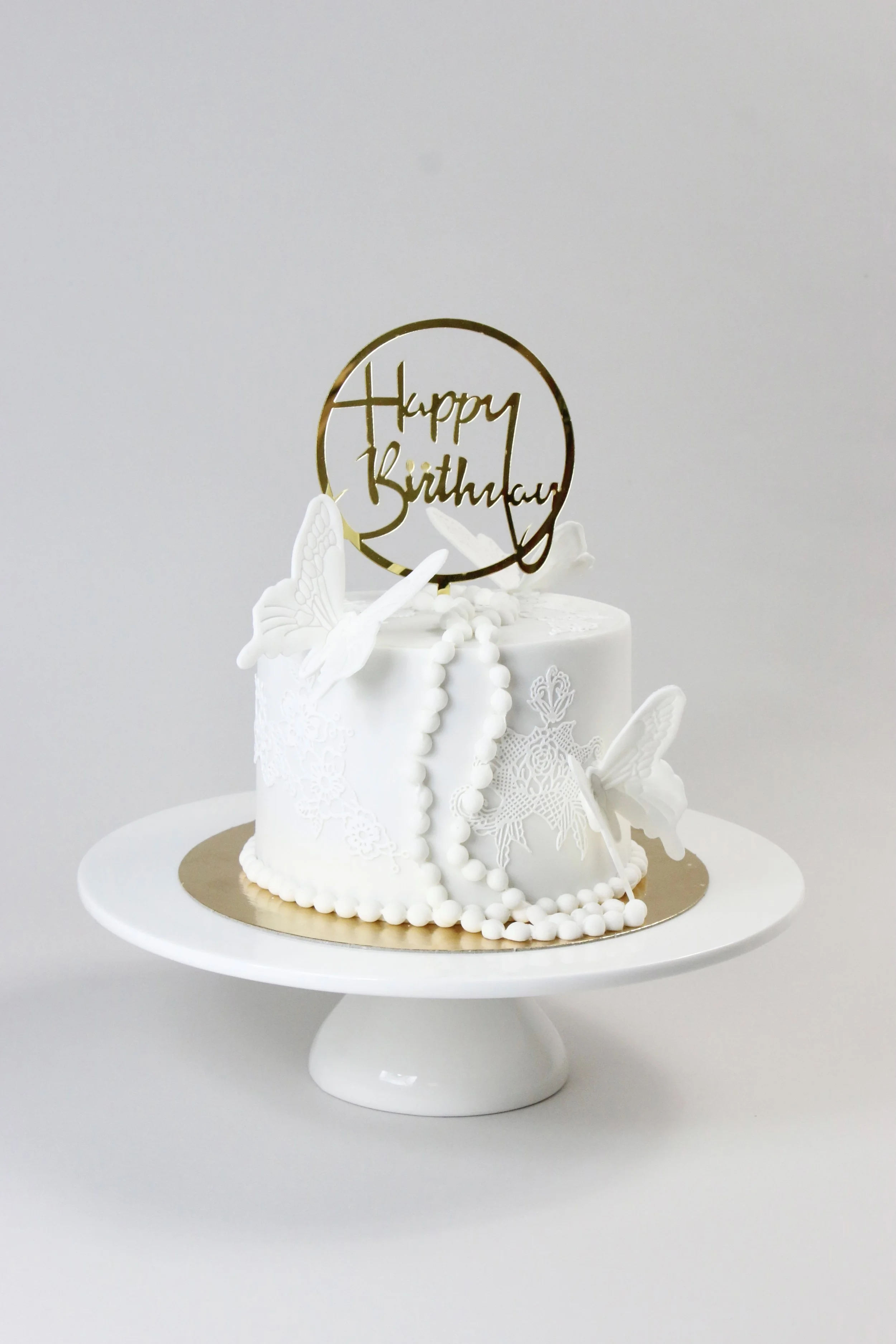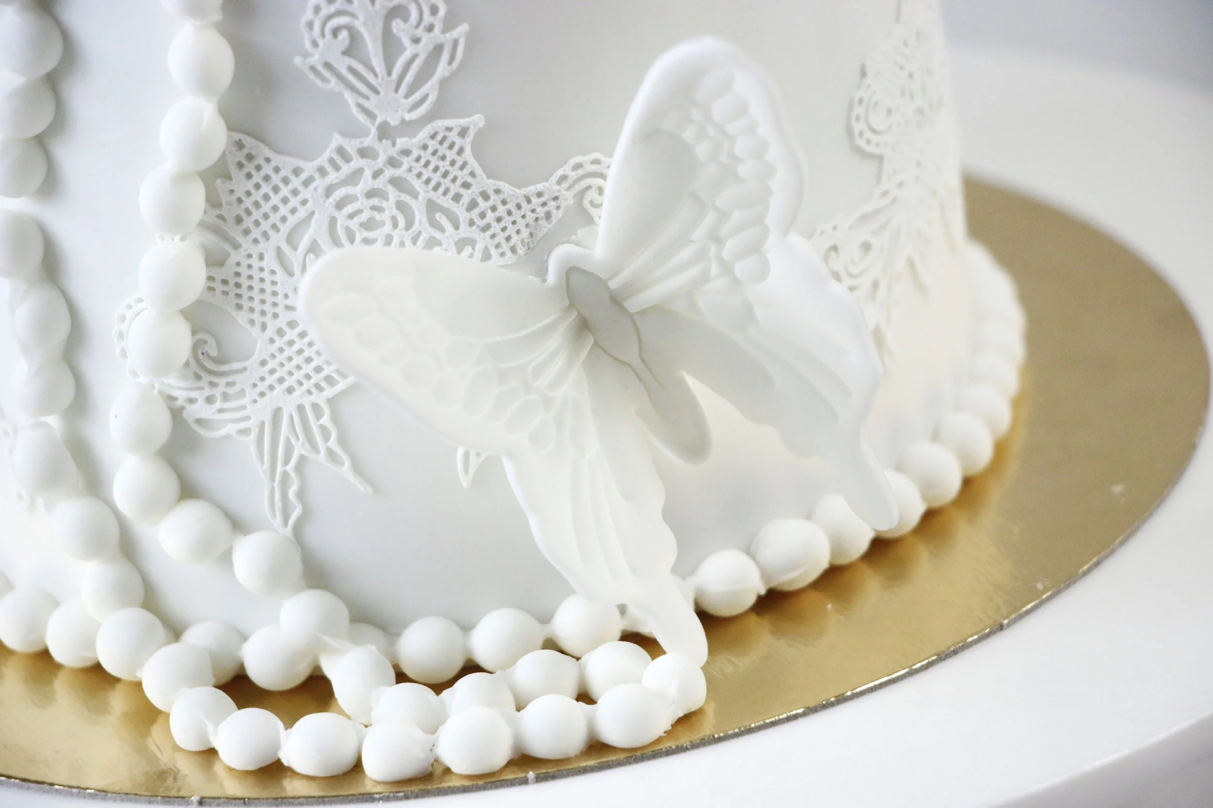 Dekoriert mit essbarer Spitze und Schmetterlinge aus Zucker.